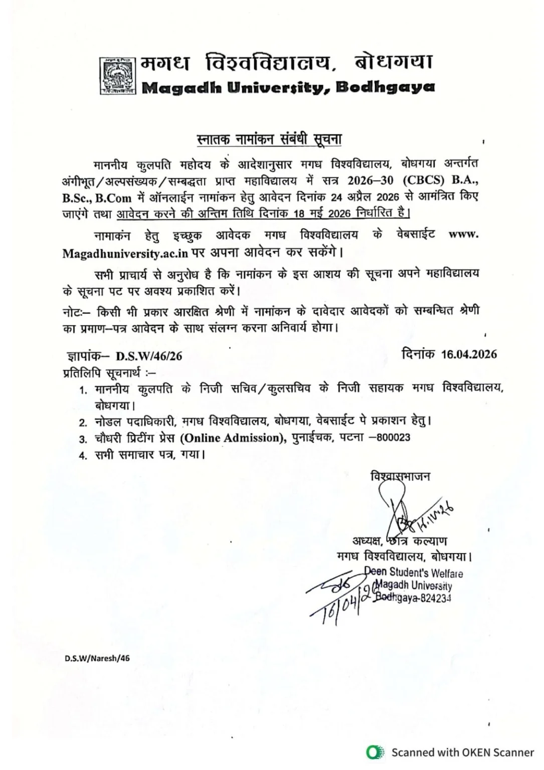 Magadh University UG Semester 1 Admission 2026-30 online applications are now officially open. Students who have cleared the Class 12 (Intermediate) examination and wish to pursue a Bachelor’s degree in Arts, Science, or Commerce under Magadh University, Bodh Gaya can apply online through the official portal at magadhonline.in. The application window opened on 24 April 2026, and the last date to submit the form is 18 May 2026.